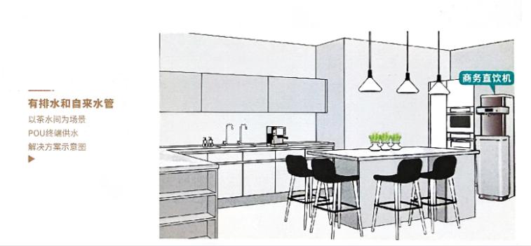 方案一:终端供水解决方案 适用于写字楼、办公室或是茶水间,提前预留好自来水和排水口,每层可根据空间大小、饮水人数配置相应的净饮水机。