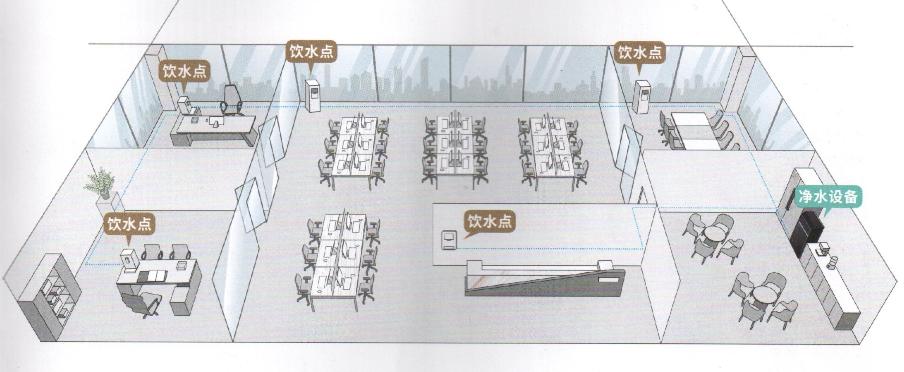 方案一:终端供水解决方案 适用于写字楼、办公室或是茶水间,提前预留好自来水和排水口,每层可根据空间大小、饮水人数配置相应的净饮水机。